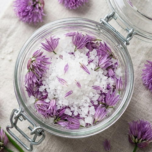 Egen örtsalt: Torkade gräslöksblommor blandad med en fin havssalt bli en vacker kombination. För övrigt kan du göra egen örtsalt med alla dina torkade kryddor.