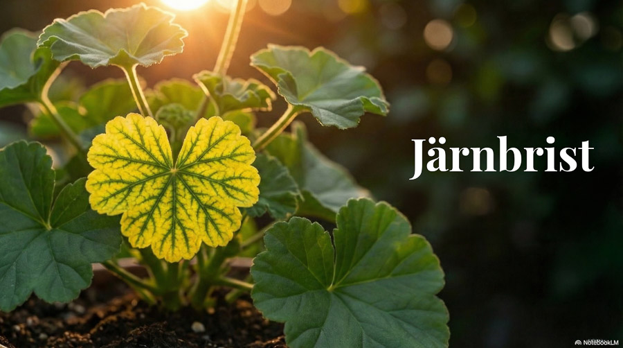 Gulnar de nedersta äldre bladen medan de yngre bladen i toppen förbli relativt gröna tyder på brist på kväve (N). Vid brist prioritera din pelargon de nya bladen och ofra de äldre. Åtgärd: Tillför flytande näring såsom Hasselfors Garden Växtnäring Universell (NPK 19-4-20).